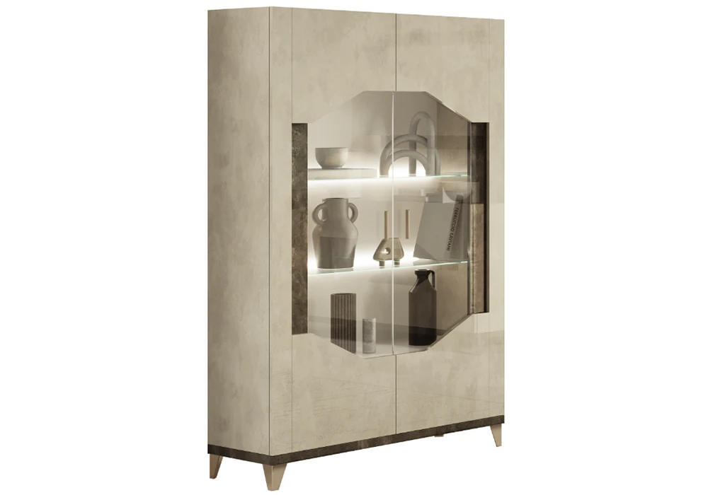 Ses pieds en acier coloris champagne ajoutent une touche de sophistication et de modernité. Les parties vitrées avec éclairage LED intégré créent une atmosphère chaleureuse et mettent en valeur vos plus beaux objets. Ce meuble allie fonctionnalité et raffinement, parfait pour enrichir votre espace de vie avec style.