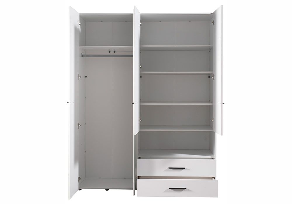 L’armoire Léon est un meuble grand format aussi pratique que bien pensé. Elle se compose de 4 portes avec une penderie, 2 grands tiroirs et 6 étagères larges et profondes. Grâce à cette grande armoire, vous aurez enfin assez d’espace pour ranger tous vos vêtements, vos accessoires et votre linge de lit. Ce meuble élégant est réalisé en panneaux de particules, un matériau robuste et léger qui résiste bien au passage du temps.