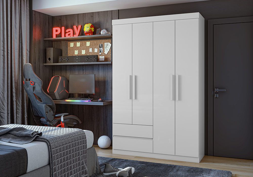 Vous rêvez d’une armoire dotée d‘espaces de rangement généreux ? Ce modèle dispose de 4 portes battantes et de 2 tiroirs. Vous aurez donc la place de stocker de nombreux vêtements sur les étagères et dans les penderies. La structure en panneaux de particules se caractérise par sa solidité et sa facilité de montage.