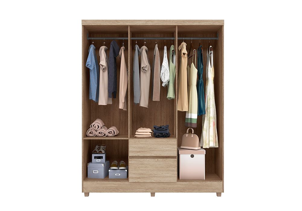 Grâce à ce grand meuble de rangement vous pourrez libérer la chambre de tous les objets encombrants ! Les 3 penderies offrent de place pour les affaires qui peuvent difficilement s’empiler. Les 2 tiroirs peuvent accueillir les chaussettes, collants et gants.
