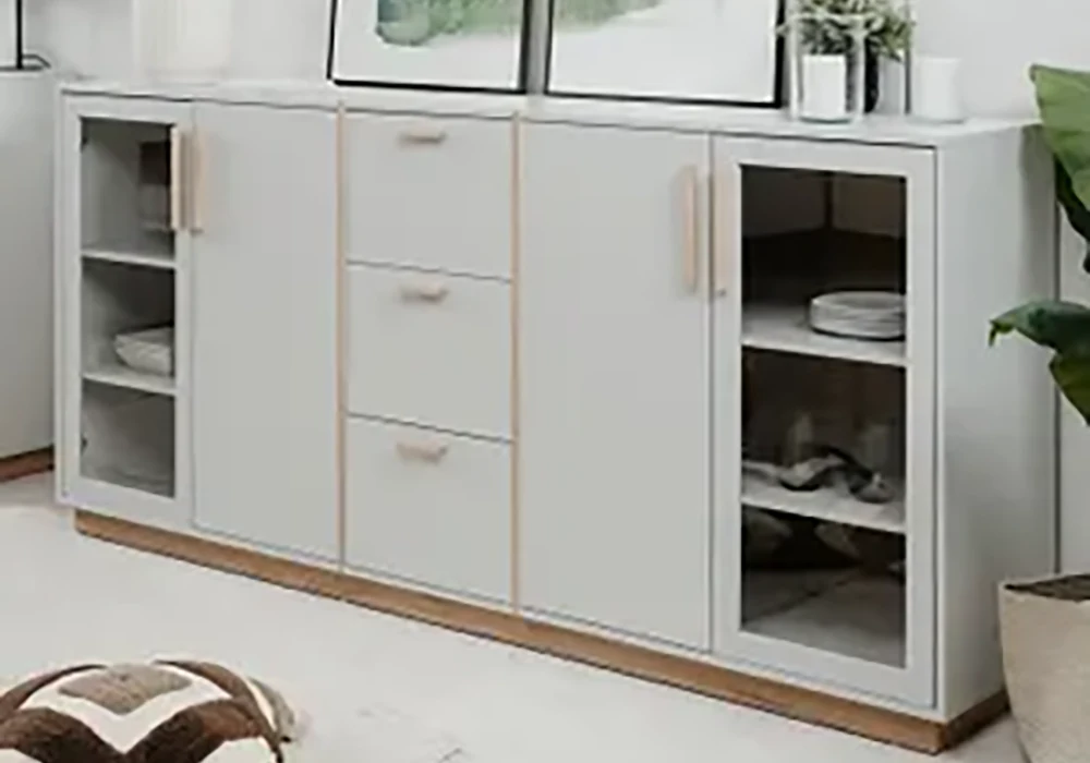 Ce bahut contemporain séduit par son design équilibré et ses finitions soignées. Sa structure en panneau de particules est habillée d’un papier décor aux nuances sonoma et gris, offrant un contraste subtil et chaleureux.