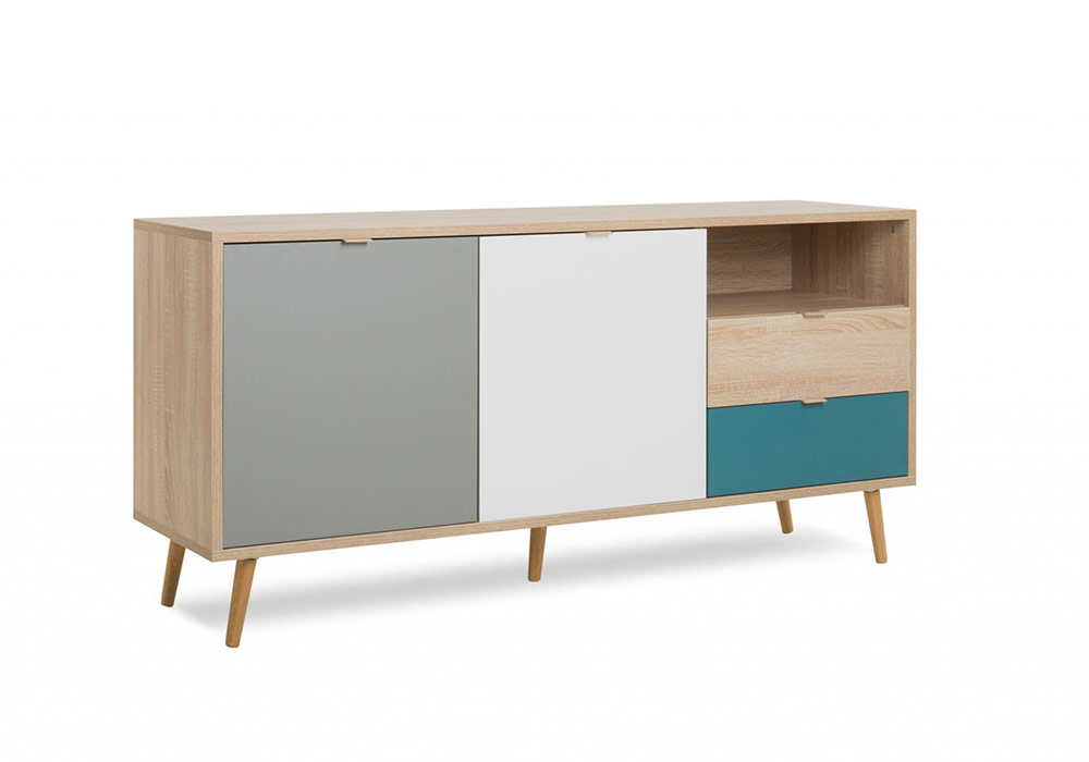 Le bahut bas 2 portes 2 tiroirs de la collection Cuba incarne l’alliance parfaite entre modernité et authenticité. Sa structure en panneau de particules, sublimée par un papier décor chêne, se décline en blanc, gris ou bleu pétrole pour créer des ambiances uniques.
