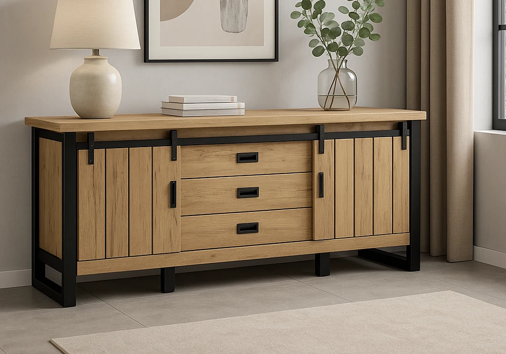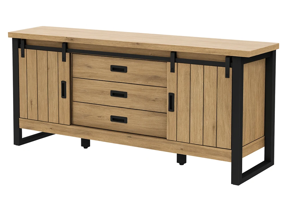 Doté de 2 portes et 3 tiroirs, ce bahut offre une capacité de rangement généreuse, idéale pour organiser vaisselle, linge de maison, documents ou objets du quotidien. Son piétement en métal noir, associé à des renforts métalliques, apporte une touche industrielle élégante et assure une stabilité renforcée.