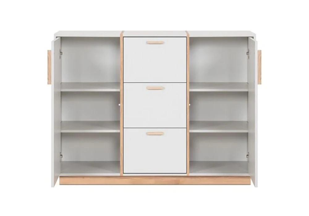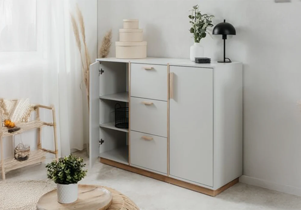 Sa structure robuste en panneau de particules, habillée d’un papier décor premium, garantit solidité et longévité. Les 2 tiroirs spacieux glissent avec fluidité pour accueillir linge ou accessoires, tandis que les 3 portes dissimulent des compartiments parfaits pour une organisation discrète et efficace.