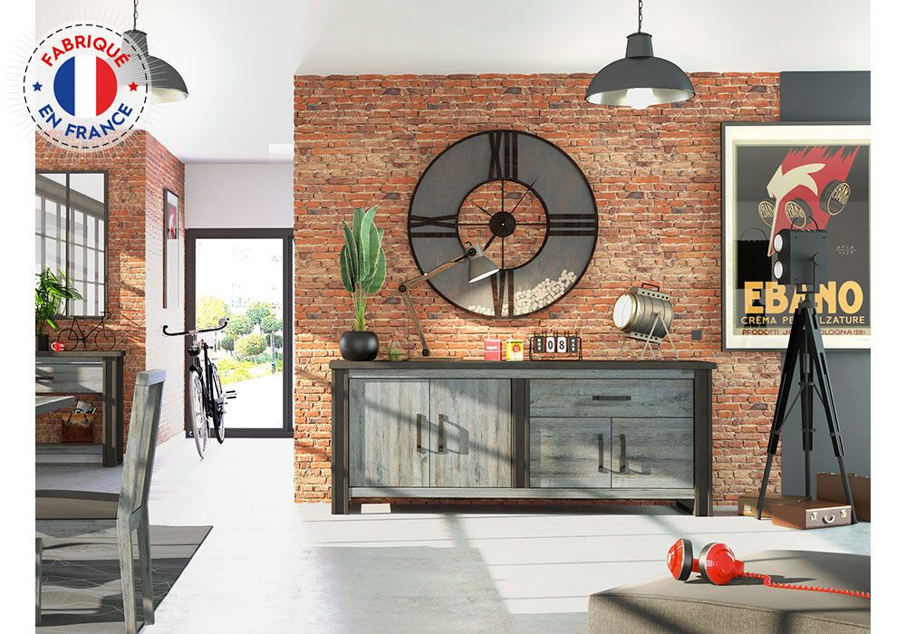 Le look du buffet Baxter lui confère à un esprit atelier. Les façades au décor chêne gris et noir anthracite dégagent une touche particulièrement agréable qui apportent à votre décoration un visuel à l’esprit industriel. Le bahut offre beaucoup de rangement derrière ses portes qui recevront votre vaisselle et vos ustensiles de salle à manger. Vos plus beaux objets décoratifs prendront tout leur sens sur le grand plateau.
