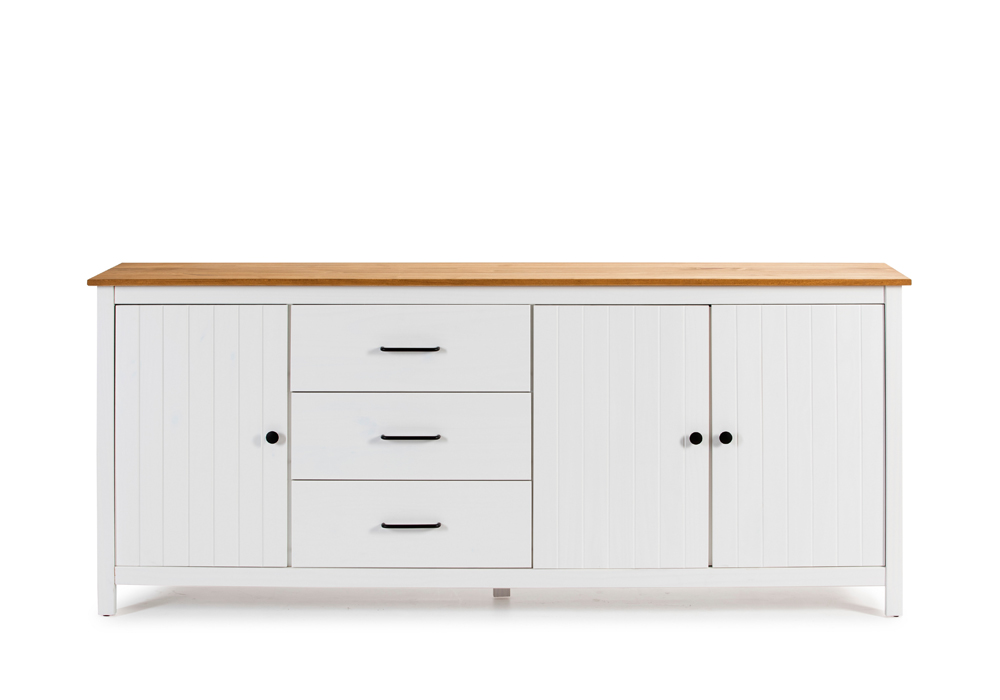 Apportez un charme campagne moderne avec ce buffet en PIN MASSIF. Large de 190cm, il est doté de 3 rangements à portes battantes et de 3 tiroirs pour vous permettre un plateau d’exposition spacieux et une organisation optimale pour votre vaisselle. Ses poignées noir lui confèrent un style authentique et une ergonomie parfaite.