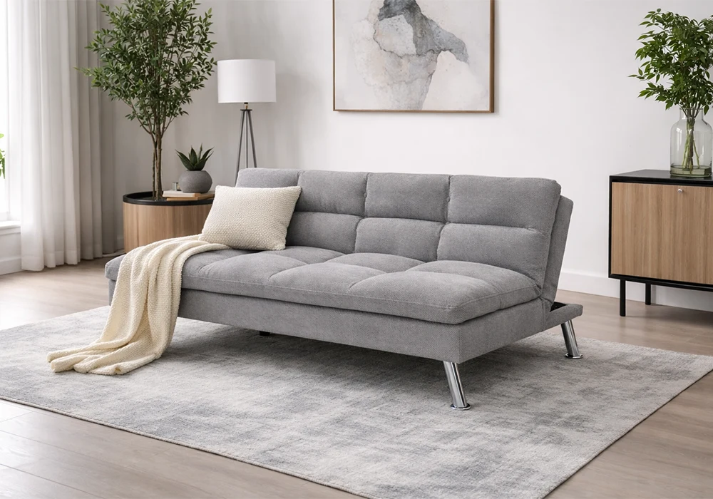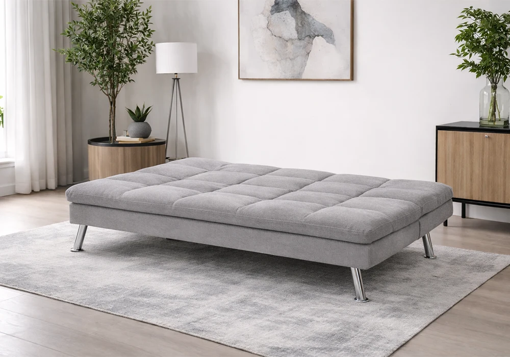 Son assise en mousse, recouverte d’un tissu microfibre disponible en gris clair ou gris, garantit un confort agréable aussi bien en position canapé qu’en couchage. La finition capitonnée matelassée apporte une touche élégante et soignée, tout en renforçant le confort visuel et l’assise.