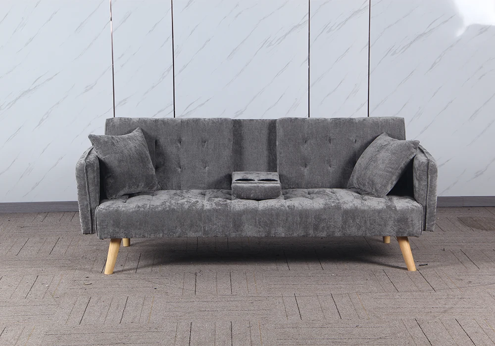 Sa console centrale intégrée apporte un vrai plus fonctionnel, idéale pour poser boissons, télécommandes ou objets du quotidien. L’assise, garnie de mousse et revêtue d’un tissu microfibre gris clair, offre un toucher doux et agréable, tout en garantissant un entretien facile, parfaitement adapté à un usage régulier.