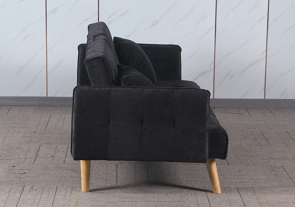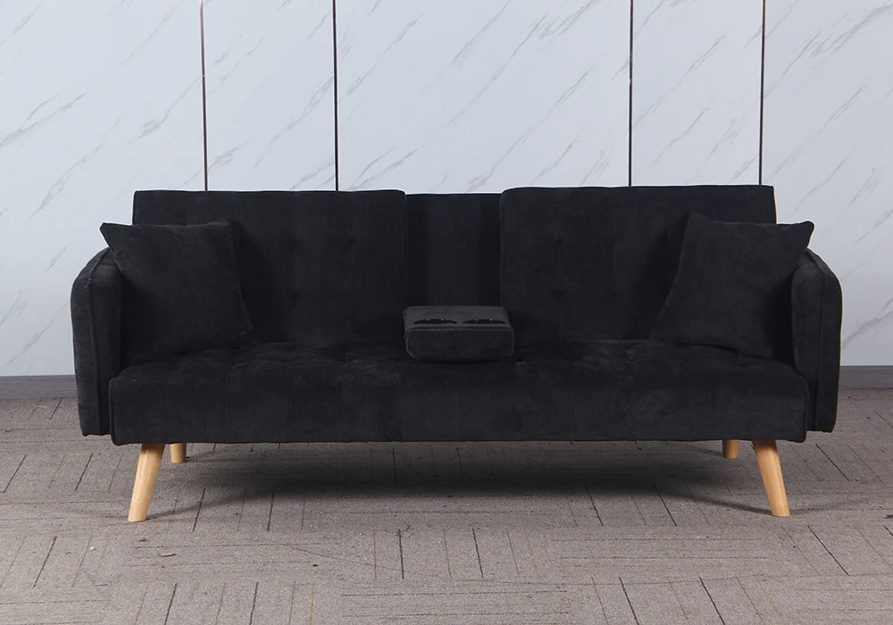 Sa console centrale intégrée apporte un vrai plus fonctionnel, idéale pour poser boissons, télécommandes ou objets du quotidien. L’assise, garnie de mousse et revêtue d’un tissu microfibre gris foncé, offre un toucher doux et agréable, tout en garantissant un entretien facile, parfaitement adapté à un usage régulier.