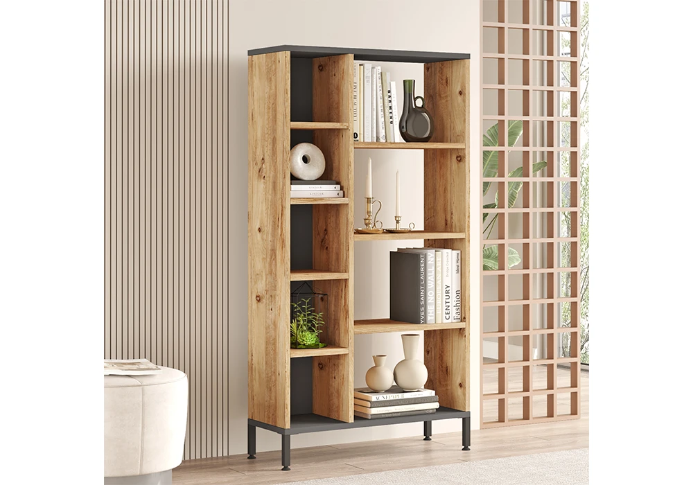 Très peu encombrante mais spacieuse grâce à sa faible largeur et son importante hauteur, la bibliothèque design industriel Evia accueillera vos livres, mais pas seulement. Sa structure en métal et son coloris bois dévoilent un style résolument moderne qui se fondra facilement à votre décoration intérieure.