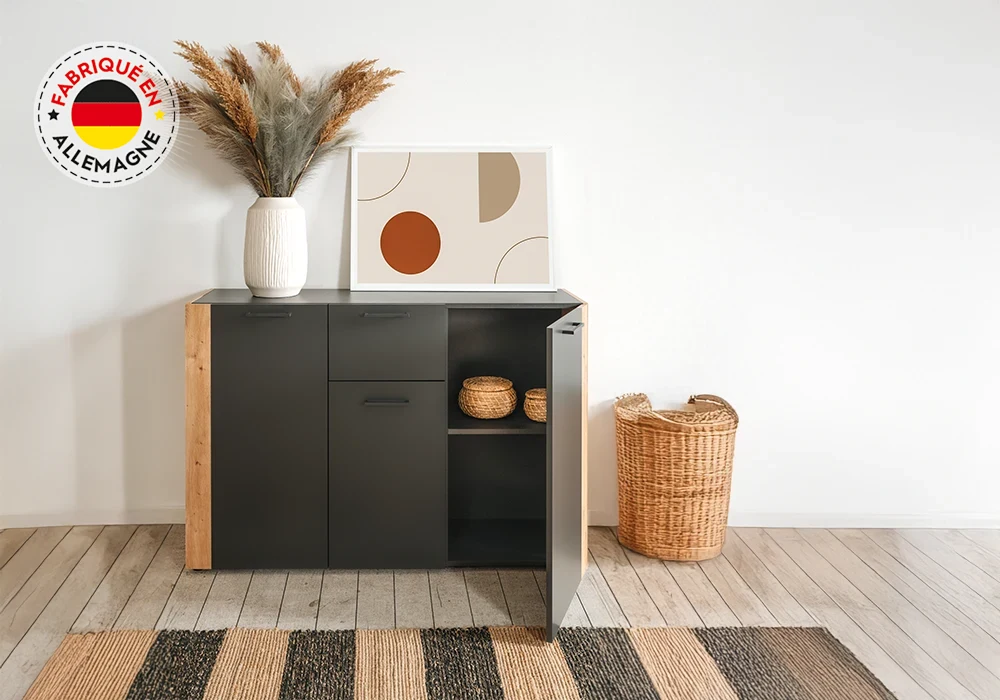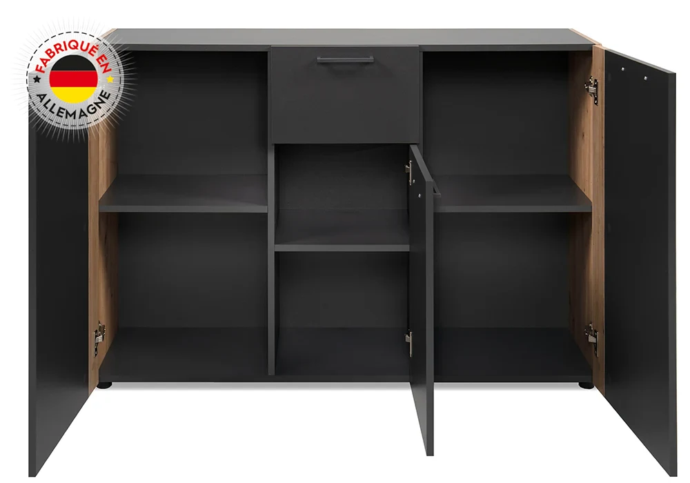 Le buffet CENTO se distingue par son design contemporain et ses finitions élégantes, idéale pour apporter du caractère à votre salon ou salle à manger. Sa structure en panneau de particules recouverte de papier décor anthracite / chêne artisan offre un contraste raffiné, mêlant modernité et chaleur naturelle.