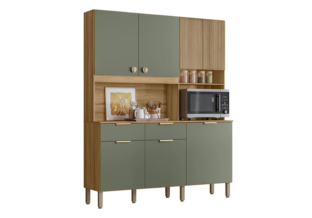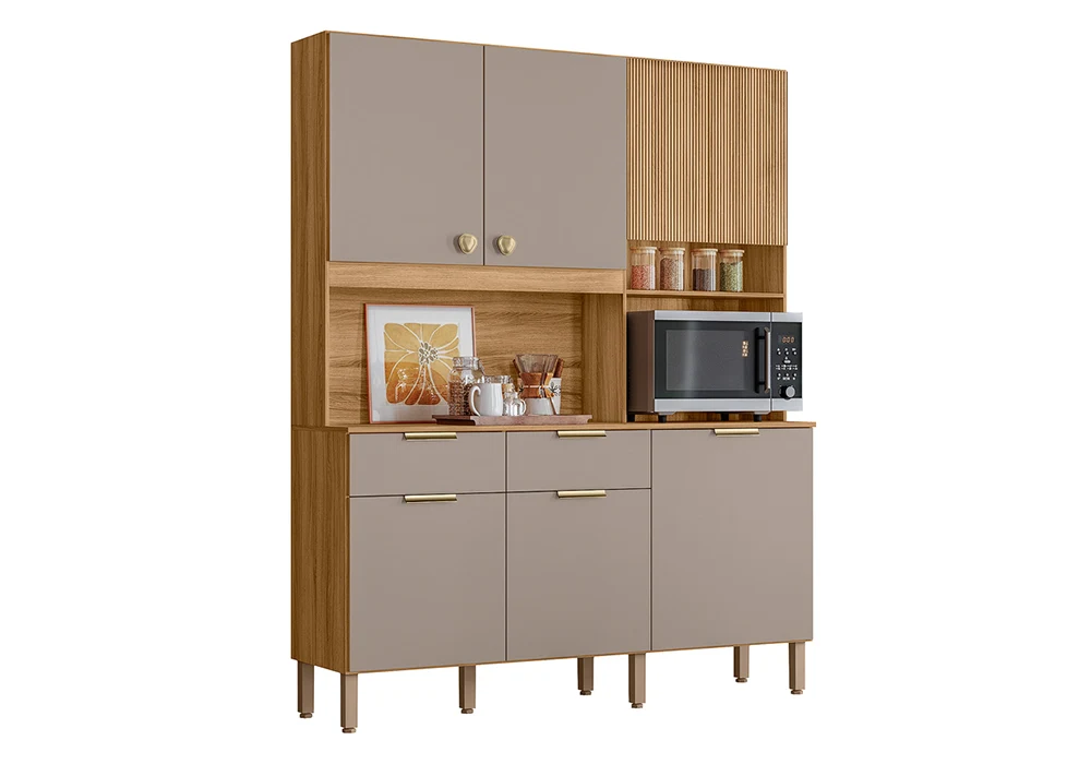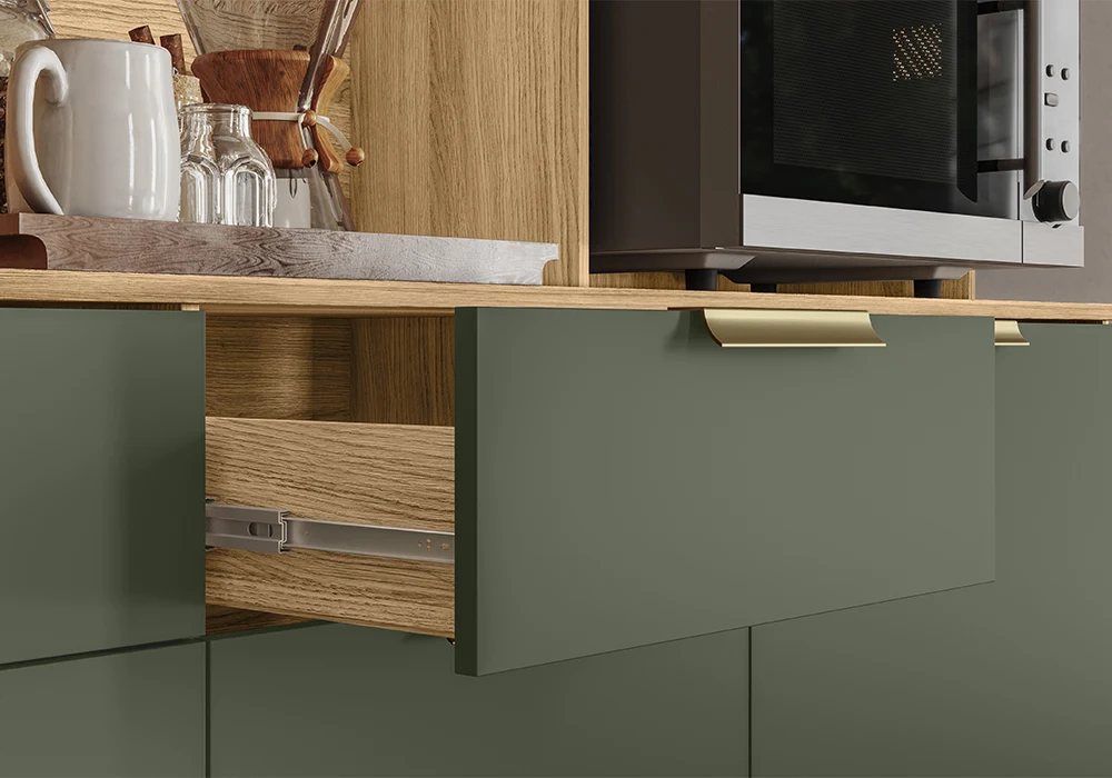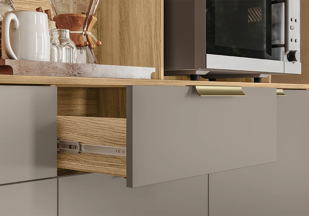 Un emplacement central a été spécialement conçu pour accueillir votre cafetière ou votre micro-ondes, facilitant l’accès à vos appareils du quotidien sans compromettre l’harmonie visuelle de l’ensemble.