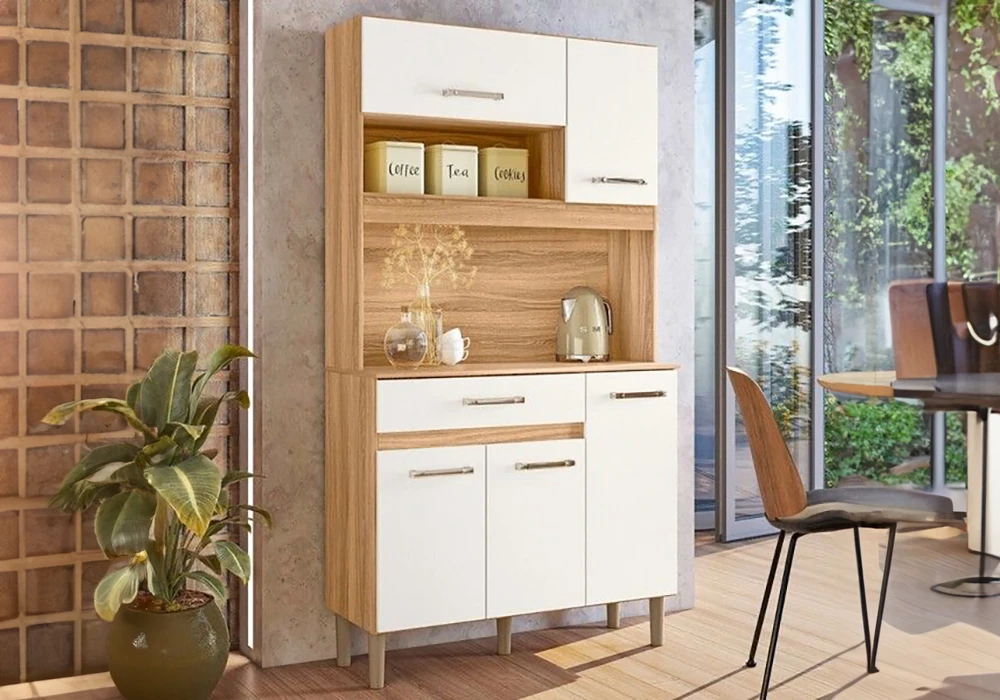 Parfait pour vos besoins de rangement, ce buffet offre des espaces généreux pour organiser vos ustensiles, vaisselle et provisions. Sa conception inclut un emplacement dédié pour micro-onde ou cafetière, ajoutant une note de fonctionnalité à votre cuisine. Le design épuré et les tons harmonieux de ce buffet s’intègrent parfaitement dans divers styles de décoration, créant un environnement à la fois accueillant et organisé.
