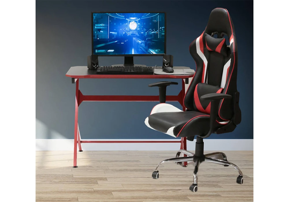 Le bureau gaming allie style et fonctionnalité. Son piétement en acier rouge est du plus bel effet. Sa finition en noir et rouge lui confère un look moderne et audacieux. Le plateau spacieux vous permet d’installer votre ordinateur, votre clavier, votre souris et d’autres accessoires sans vous sentir à l’étroit.