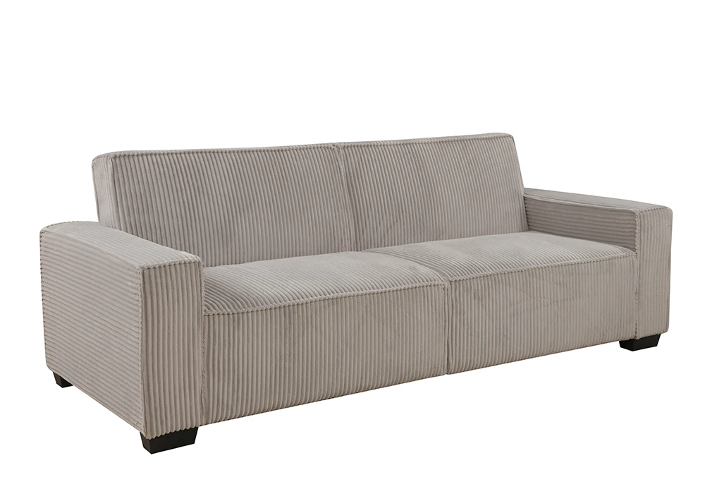Structure en HÊTRE MASSIF et panneau de particules, assise mousse en polyuréthane de 25 kg/m3 recouverte de tissus microfibre côtelé épais coloris beige, gris clair ou gris foncé.