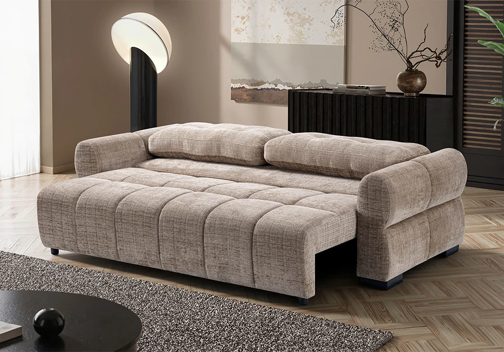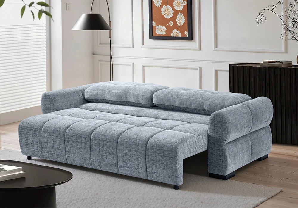 Ce canapé 3 places se transforme en lit en quelques secondes grâce à son système d’ouverture glissant type tiroir. Une fois ouvert, il offre un couchage confortable de 236 × 155 cm, parfait pour accueillir vos invités. Fermé, ses dimensions de 236 × 101 × 92 cm permettent de profiter d’un large espace de détente.