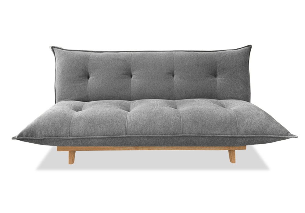 Structure en BOIS et panneau de particules, assise mousse en plume façon futon coloris gris, piètement en HÊTRE MASSIF.