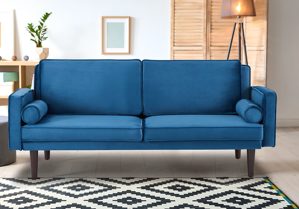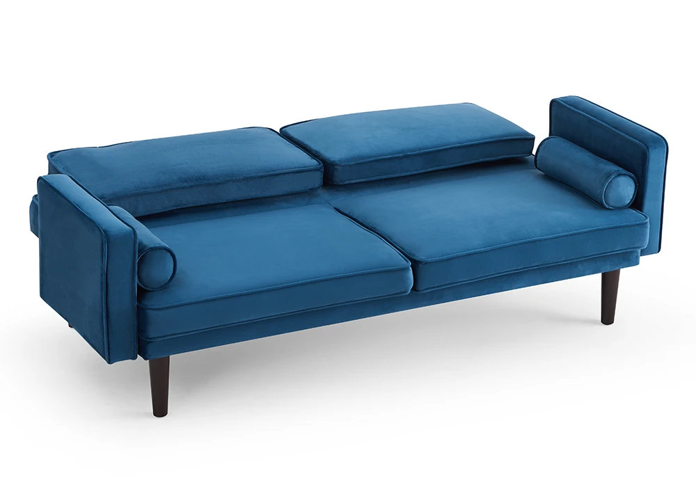 Structure en BOIS D’EUCLYPTUS, assise mousse en polyuréthane, matelas HD 25kg recouvert d’une housse en tissus bleu velvet.