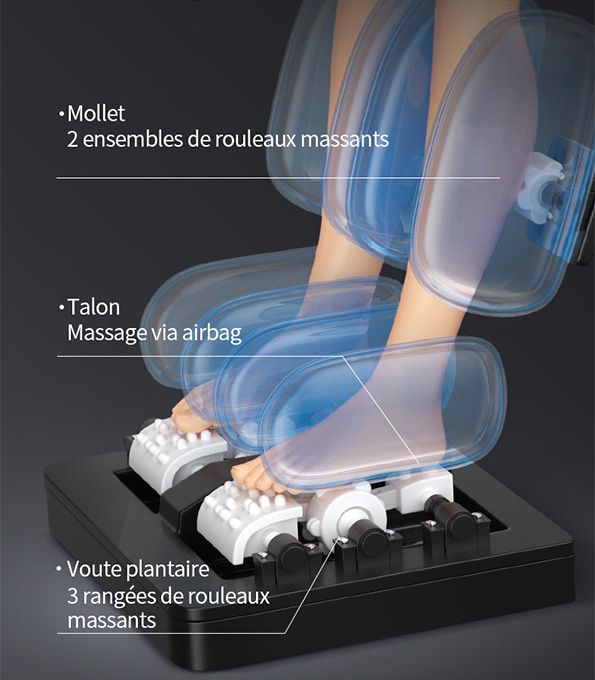 Notre capsule de massage est équipé de rouleaux de massage sur le dessous des pieds pour masser les points de pression qui correspondent à différentes parties du corps, tels que les organes internes et les muscles.