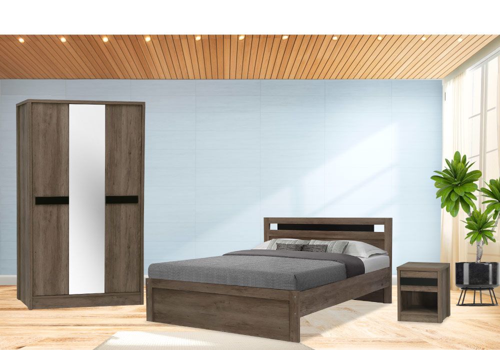 L’ensemble de mobilier de chambre Monique se compose d’une armoire, d’un lit et d’1 chevet. La grande armoire qui est équipée de 3 portes avec miroir derrière lesquelles il y a de beaux volumes de rangement. Le lit 140×190 cm se caractérise par un look tendance et promet un confort de sommeil optimal.
