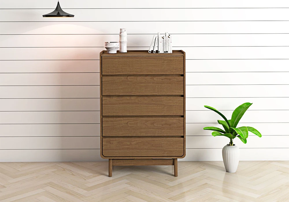 Découvrez l’élégance intemporelle de notre chiffonnier 5 tiroirs de la collection Sandra. Sa structure solide en panneau de particules est habillée de papier décor oak, conférant à chaque pièce un charme naturel et authentique.