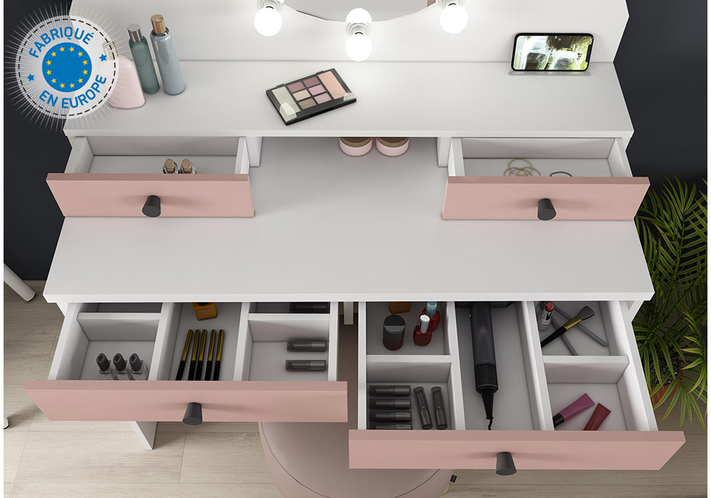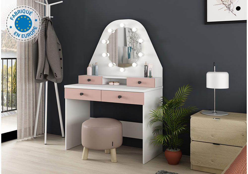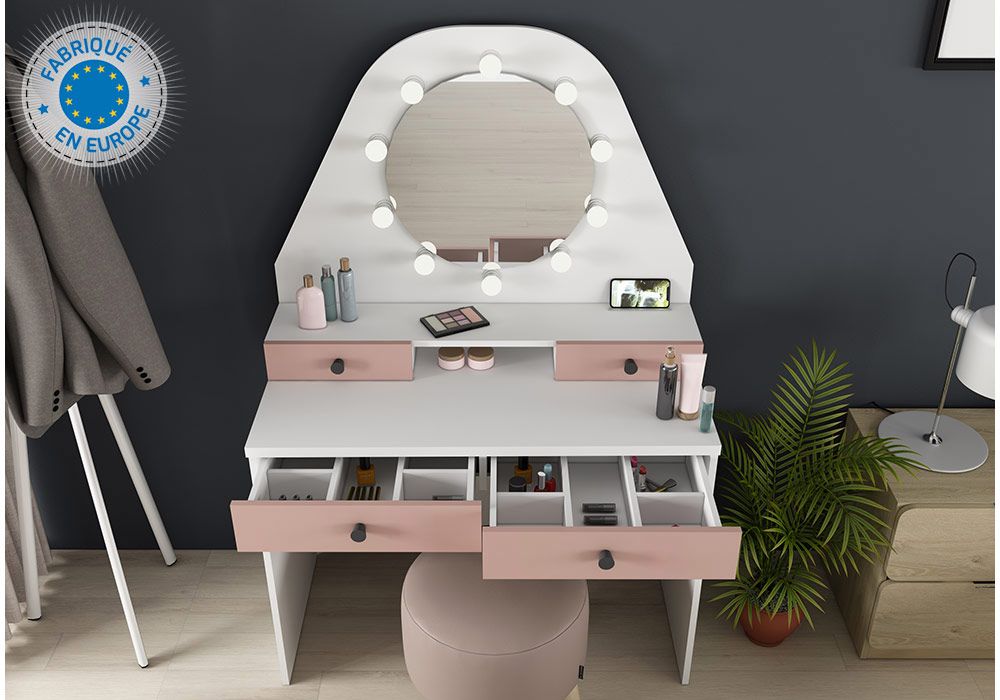 Craquez pour le style rétro de la coiffeuse Star avec son grand miroir rond éclairé par des ampoules, elle apportera charme et élégance à votre chambre. Ses 4 tiroirs de rangements rose apporteront de la douceur à ce meuble et vous permettront d’organiser tout votre nécessaire de beauté.