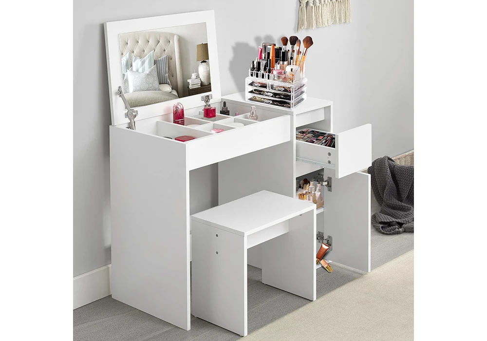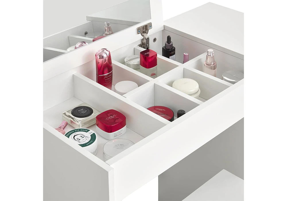 Le dessus de la coiffeuse se lève pour révéler un miroir éblouissant ainsi qu’un espace de rangement avec plusieurs compartiments pour vos bijoux ou produits de beauté. En basculant le miroir, vous disposerez d’un excellent bureau pour écrire et travailler.