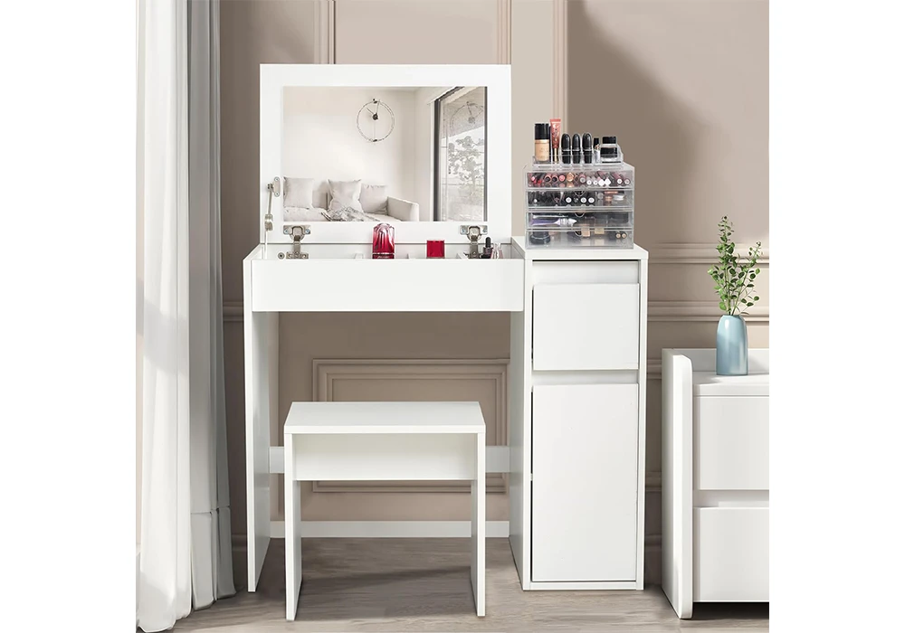 Fabriquée en panneau de particules et MDF, cette coiffeuse est recouverte de papier blanc pour une finition épurée et contemporaine. La coiffeuse dispose d’un tiroir spacieux et d’une porte dqui vous permettent de ranger vos produits de beauté et accessoires de manière organisée.