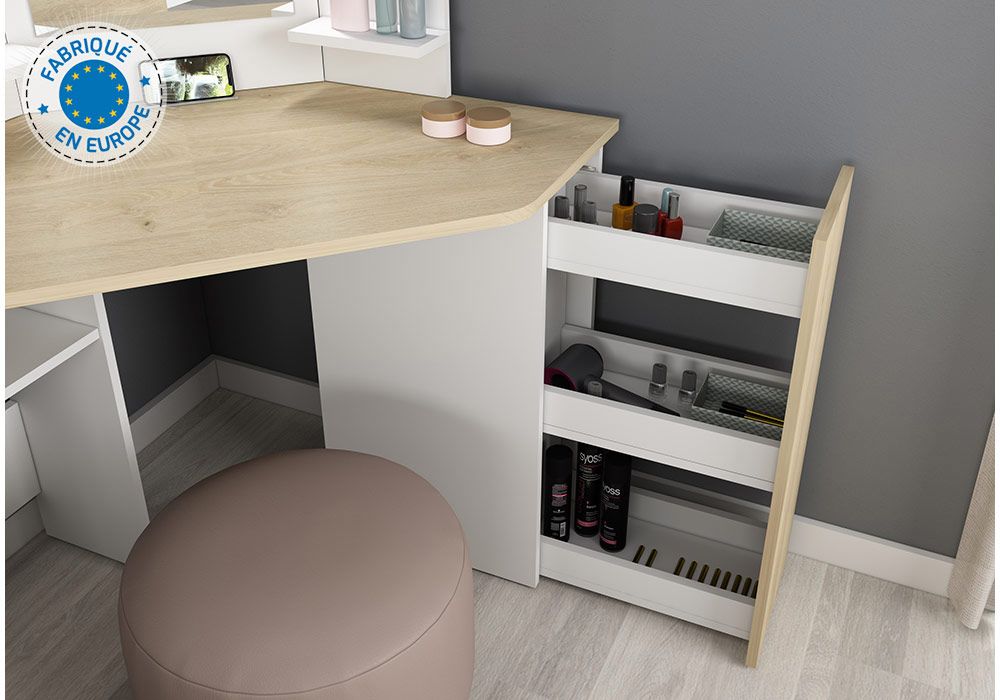 La coiffeuse Secret est réalisée en panneaux de particules avec finition blanche. Combinez-la avec un tabouret assorti ou une chaise confortable et accordez-vous chaque jour un moment de détente.