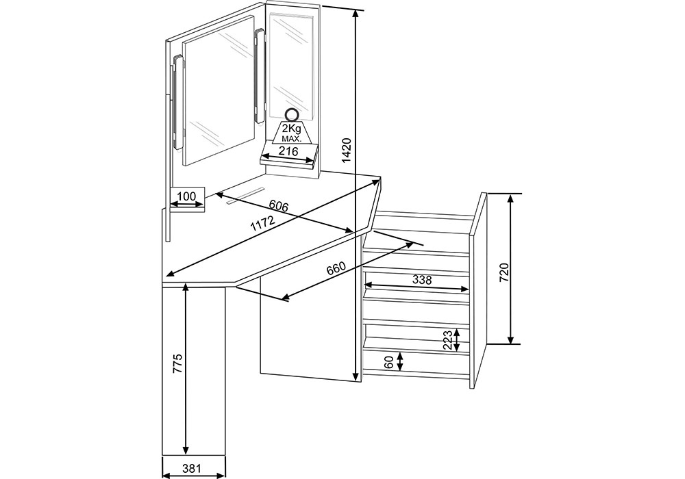 Dotée d’un design épuré et astucieux, la coiffeuse Chic répond à tous vos besoins. Cette coiffeuse compte 3 miroirs, 2 petites tablettes (poids max. 2 kg), 1 large tablette et une colonne sur roulettes à 3 compartiments.