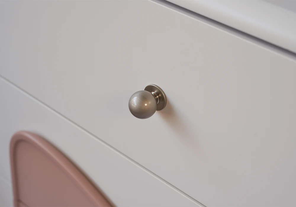 Sa structure en panneaux de particules et pin massif, recouverte de papier décor haute résistance, assure une excellente solidité et une durabilité adaptée à un usage quotidien. La finition blanc ivoire, rehaussée de poignées rose poudré, apporte une touche douce et féminine, tandis que le plateau supérieur vitré blanc à effet marbre gris ajoute une note chic et contemporaine.