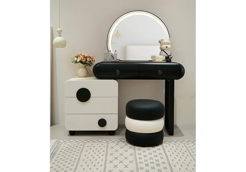 Pour un confort optimal, la coiffeuse est accompagnée d’un pouf assorti, pratique et confortable pour vos routines beauté quotidiennes. Son design compact s’adapte facilement à toutes les pièces, même les chambres disposant de peu d’espace.