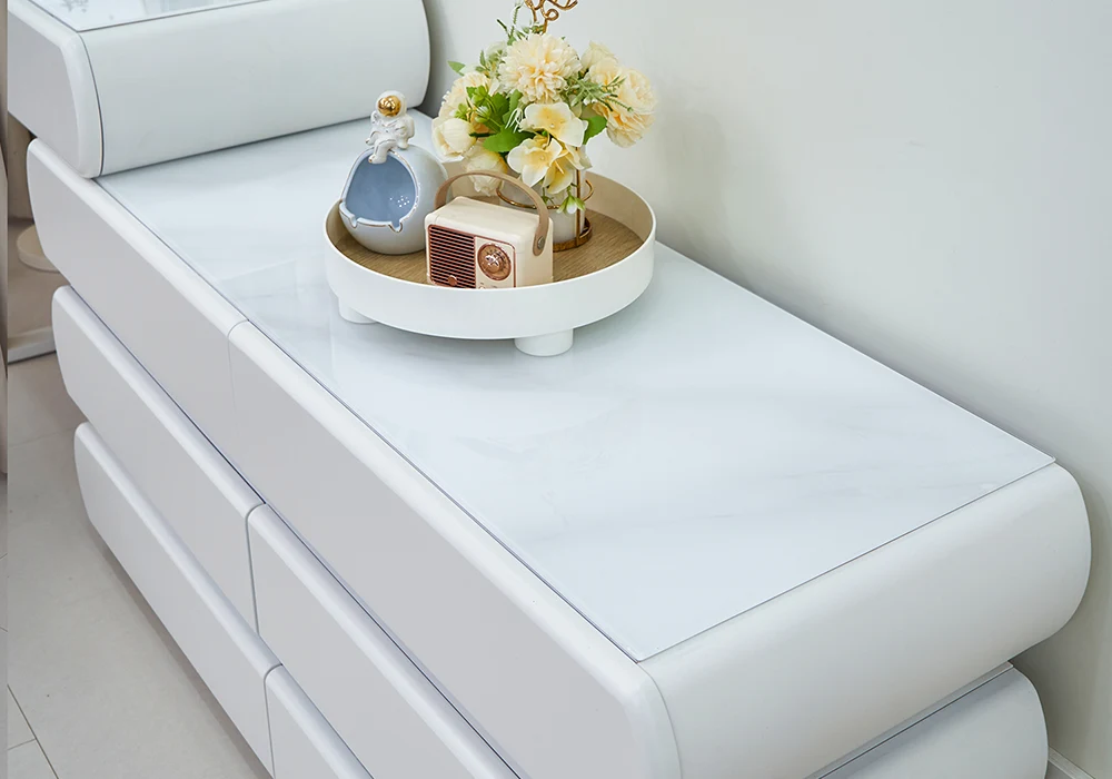 Grâce à ses 8 tiroirs spacieux, vous pouvez organiser facilement vos accessoires, produits de beauté, bijoux et outils de coiffure. Chaque élément trouve sa place, pour une coiffeuse toujours rangée et agréable à utiliser. La large surface du plateau offre suffisamment d’espace pour disposer vos produits essentiels à portée de main, sans jamais manquer de place.
