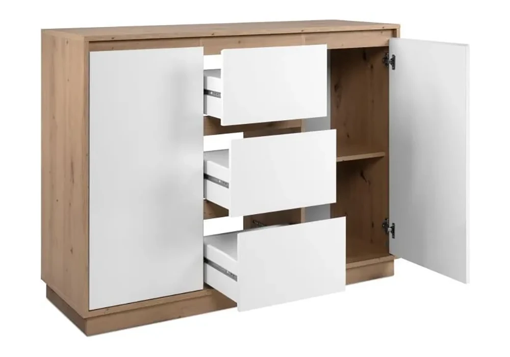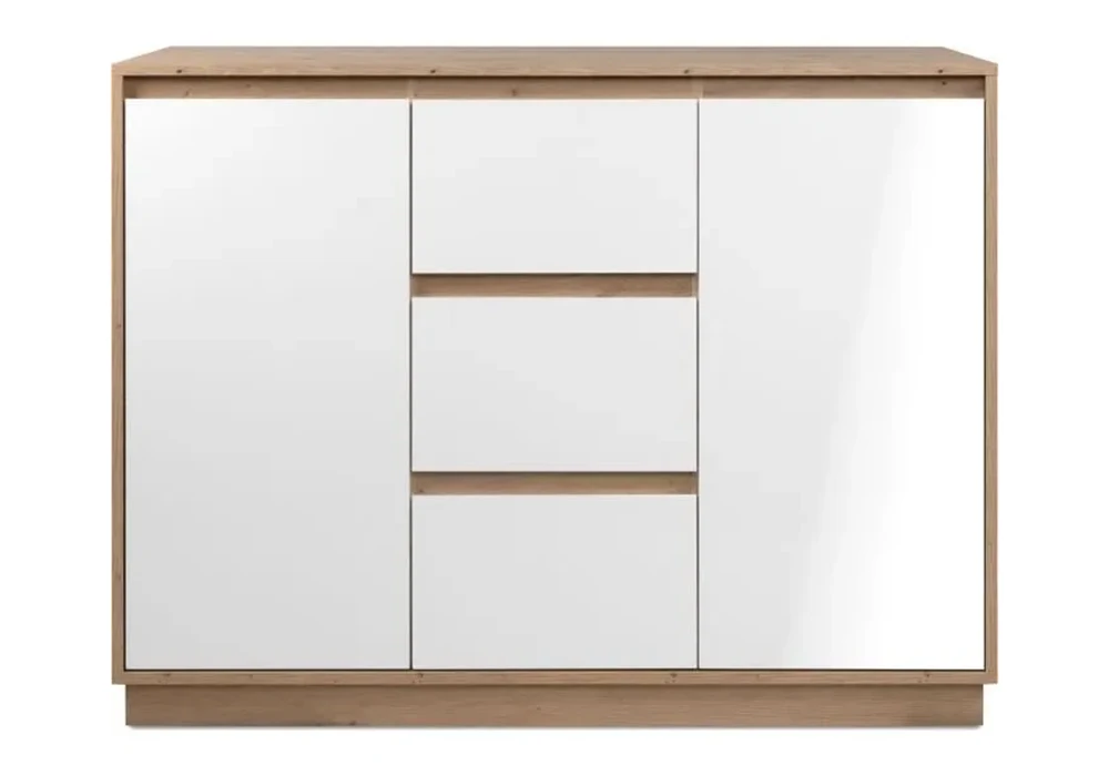 Sa structure solide fabriquée en panneau de particules mélaminé assure une solidité et une durabilité exceptionnelles. Avec ses 2 portes et 3 tiroirs spacieux, cette commode offre un vaste espace de rangement pour vos vêtements, accessoires ou autres objets du quotidien. Les lignes épurées et les couleurs raffinées confèrent à cette commode une allure chic et moderne, idéale pour sublimer votre chambre.