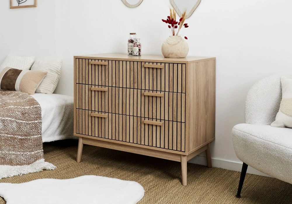 Élevez le style de votre intérieur avec notre commode à 3 tiroirs. Fabriquée à partir d’une structure robuste en panneau de particules et MDF, cette commode est à la fois solide et élégante. Son revêtement en papier décor lui confère un aspect raffiné et moderne, parfait pour sublimer n’importe quelle pièce.