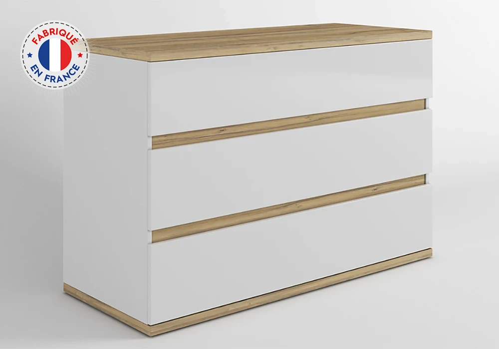 Les trois tiroirs spacieux vous permettent de ranger vos vêtements, accessoires ou autres objets personnels de manière organisée et accessible. Grâce à son design épuré et ses finitions soignées, cette commode s’intègre harmonieusement dans n’importe quelle pièce de votre maison, que ce soit la chambre, le salon ou même le bureau.