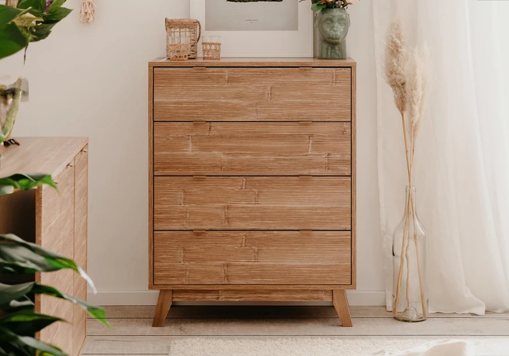 Apportez une touche d’élégance naturelle à votre intérieur avec cette magnifique commode à 4 tiroirs de la collection Boobang. Conçue avec une structure robuste en panneau de particules mélaminé, elle est recouverte d’un papier décoratif imitant parfaitement le bambou, offrant ainsi une esthétique à la fois moderne et chaleureuse.