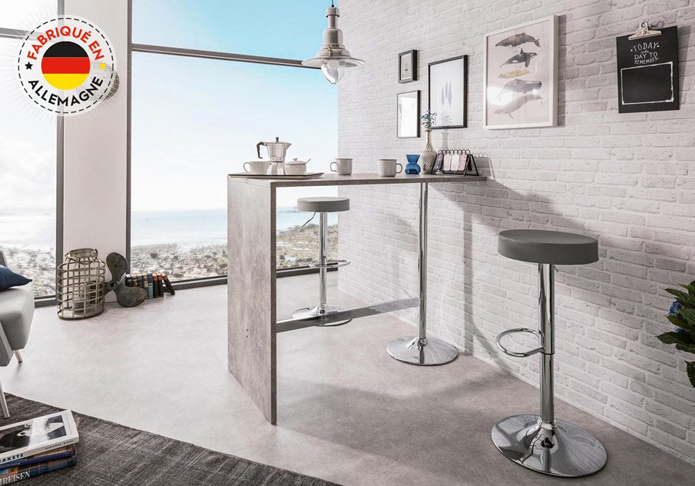 Comptoir bar moderne en panneau de particules recouverte de papier coloris béton, piétement en métal, L120xP60xH105cm.