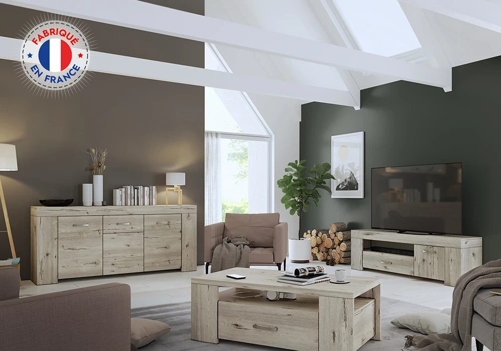 Séjour moderne en panneau de particules épais recouverte de papier décor coloris chêne champêtre.