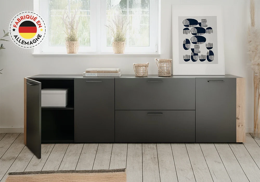L’enfilade CENTO se distingue par son design contemporain et ses finitions élégantes, idéale pour apporter du caractère à votre salon ou salle à manger. Sa structure en panneau de particules recouverte de papier décor anthracite / chêne artisan offre un contraste raffiné, mêlant modernité et chaleur naturelle.