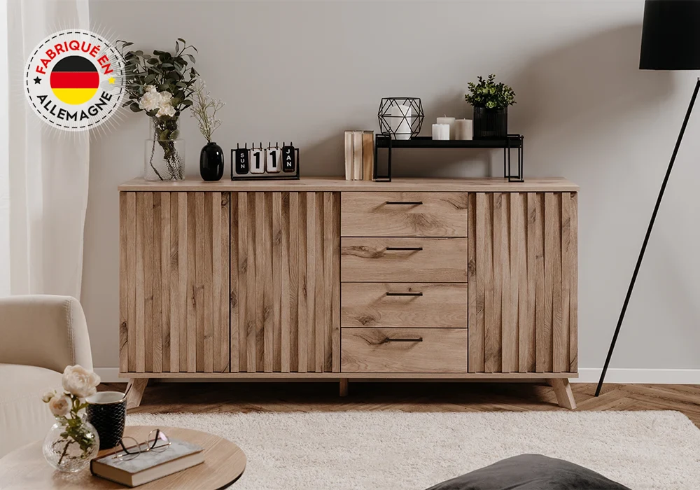 Conçue pour offrir une organisation optimale, elle dispose de 3 portes et 4 tiroirs, parfaits pour ranger vaisselle, linge de table, documents ou accessoires du quotidien. Chaque compartiment est pensé pour maximiser l’espace disponible tout en gardant un aspect visuellement harmonieux.