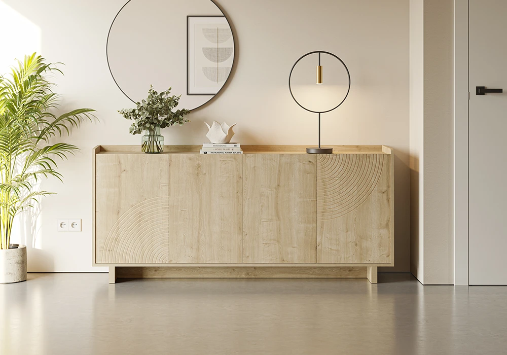 Apportez une touche de modernité et d’élégance à votre intérieur avec ce meuble enfilade de la collection Daira. Sa structure en panneau de particules mélaminé assure robustesse et durabilité, tandis que son placage en chêne naturel confère une esthétique raffinée et contemporaine.