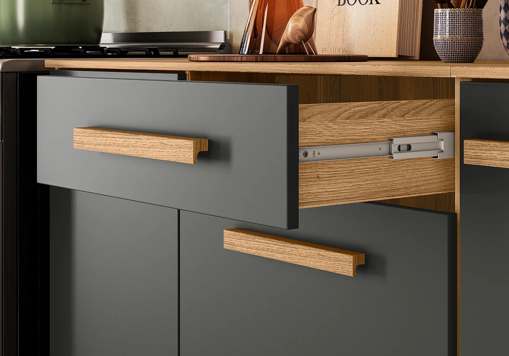 • Les facades gris foncés s’harmonisent également avec le bois couleur merisier