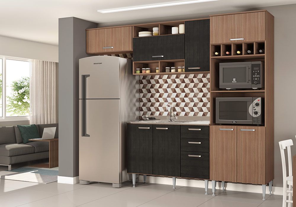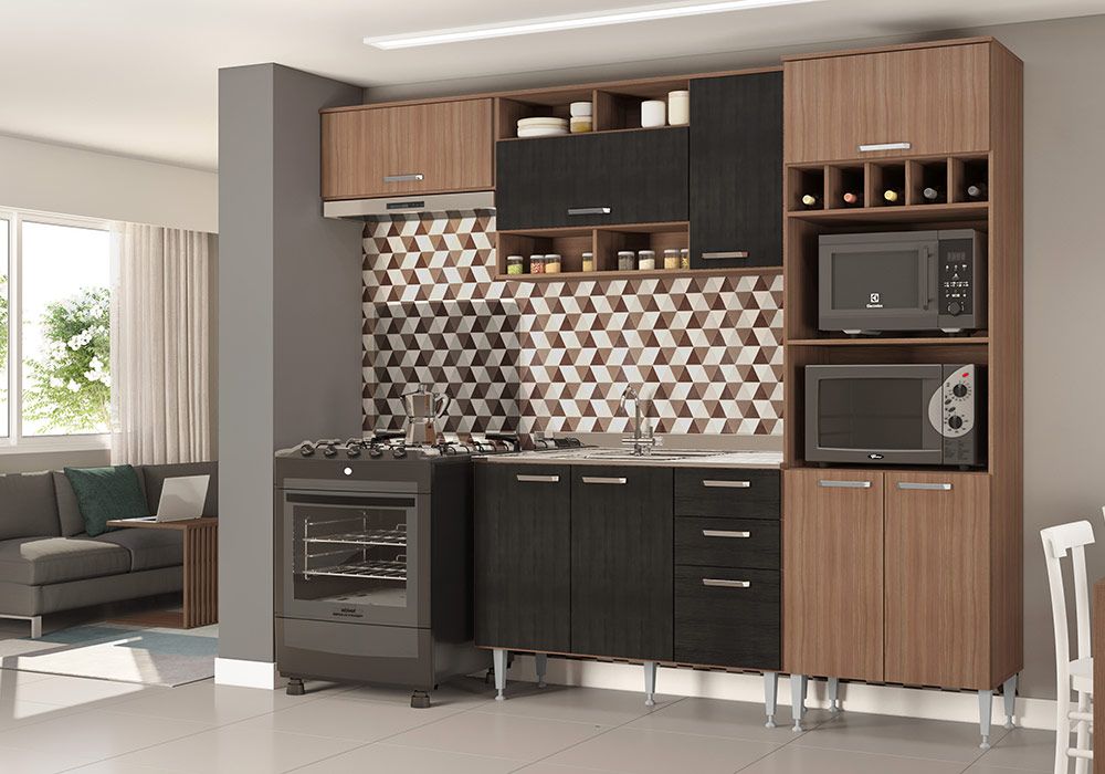 La forme pratique et les couleurs tendance rendent cet ensemble de cuisine attrayant et très fonctionnel. La cuisine intégrée proposée ici convient particulièrement aux petits espaces. La façade en noir et chêne foncé s’harmonisent à merveille et confèrent à chaque cuisine un style moderne.
