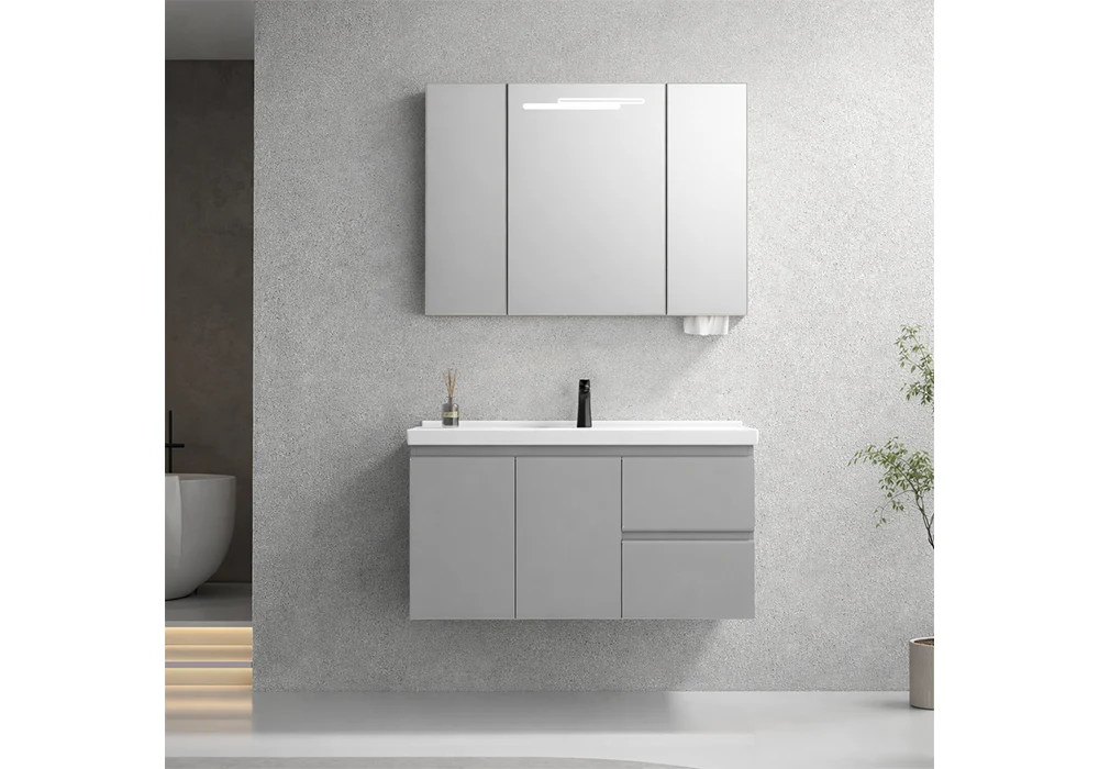 Avec son coloris gris tendance, ses nombreux espaces de rangement, son miroir LED intégré et sa conception solide, l’Ensemble BELIA 90 cm constitue un choix idéal pour aménager une salle de bain moderne, fonctionnelle et élégante.