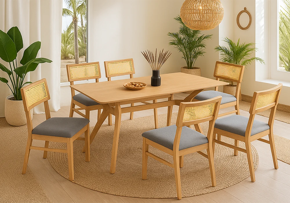 Les 6 chaises assorties allient confort et style : leur dossier en cannage apporte une touche naturelle, tandis que l’assise rembourrée en mousse polyuréthane recouverte de tissu gris clair garantit un confort optimal. Le piètement en bois d’hévéa complète harmonieusement l’ensemble.