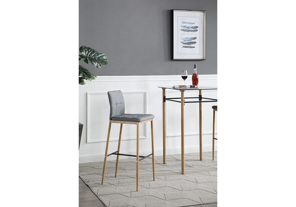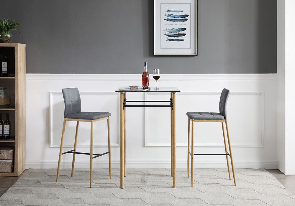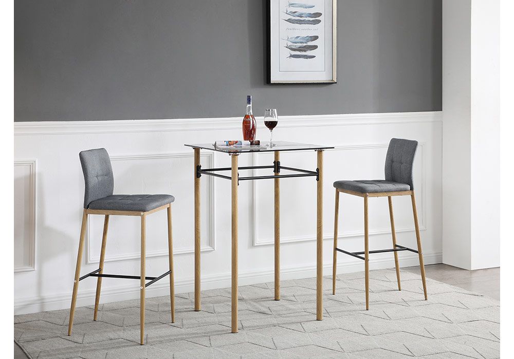 Structure de la table en métal recouverte de papier imitation bois, vitre en verre trempé 8mm. Structure du tabouret en métal, assise recouverte de tissus coloris gris.