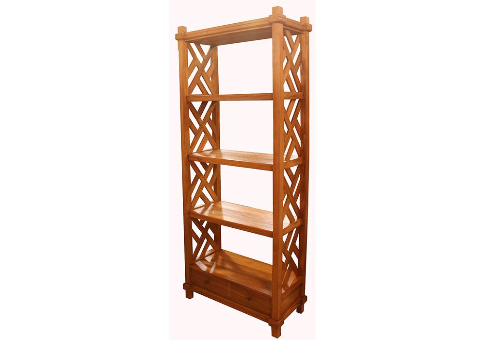 Cette bibliothèque en teck séduit par ses formes simples, un socle massif et des motifs qui apportent le grain de folie.