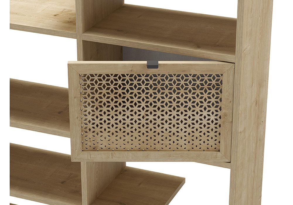 Structure en panneau de particules et MDF coloris chêne, piétement en métal coloris noir.