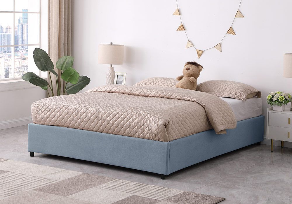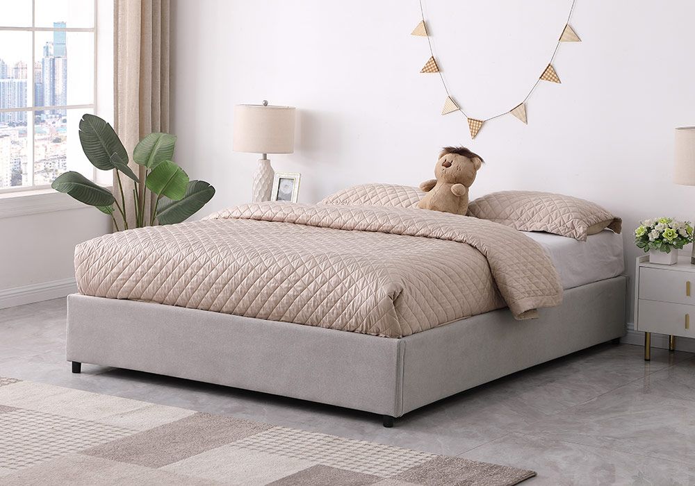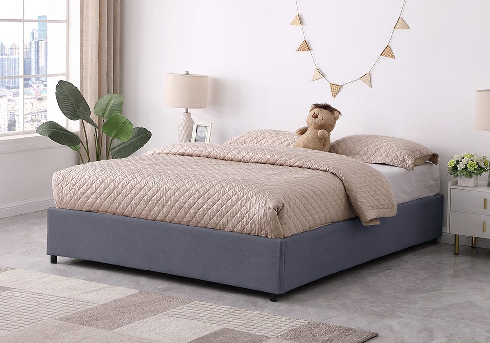 Structure en panneau de particules recouvert de tissus microfibre coloris gris clair, gris foncé ou taupe. Vendu SANS MATELAS.